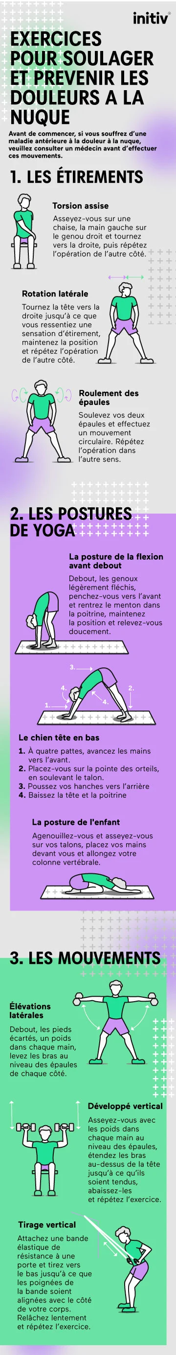 Si votre douleur cervicale est due à une tension musculaire ou à une mauvaise posture, alors les étirements et le yoga peuvent aider à soulager les muscles tendus autour de la nuque, tandis que les exercices avec répétition peuvent renforcer les muscles de votre dos pour mieux soutenir votre posture. Vous constaterez peut-être que les étirements aident à soulager la douleur causée par les muscles tendus.