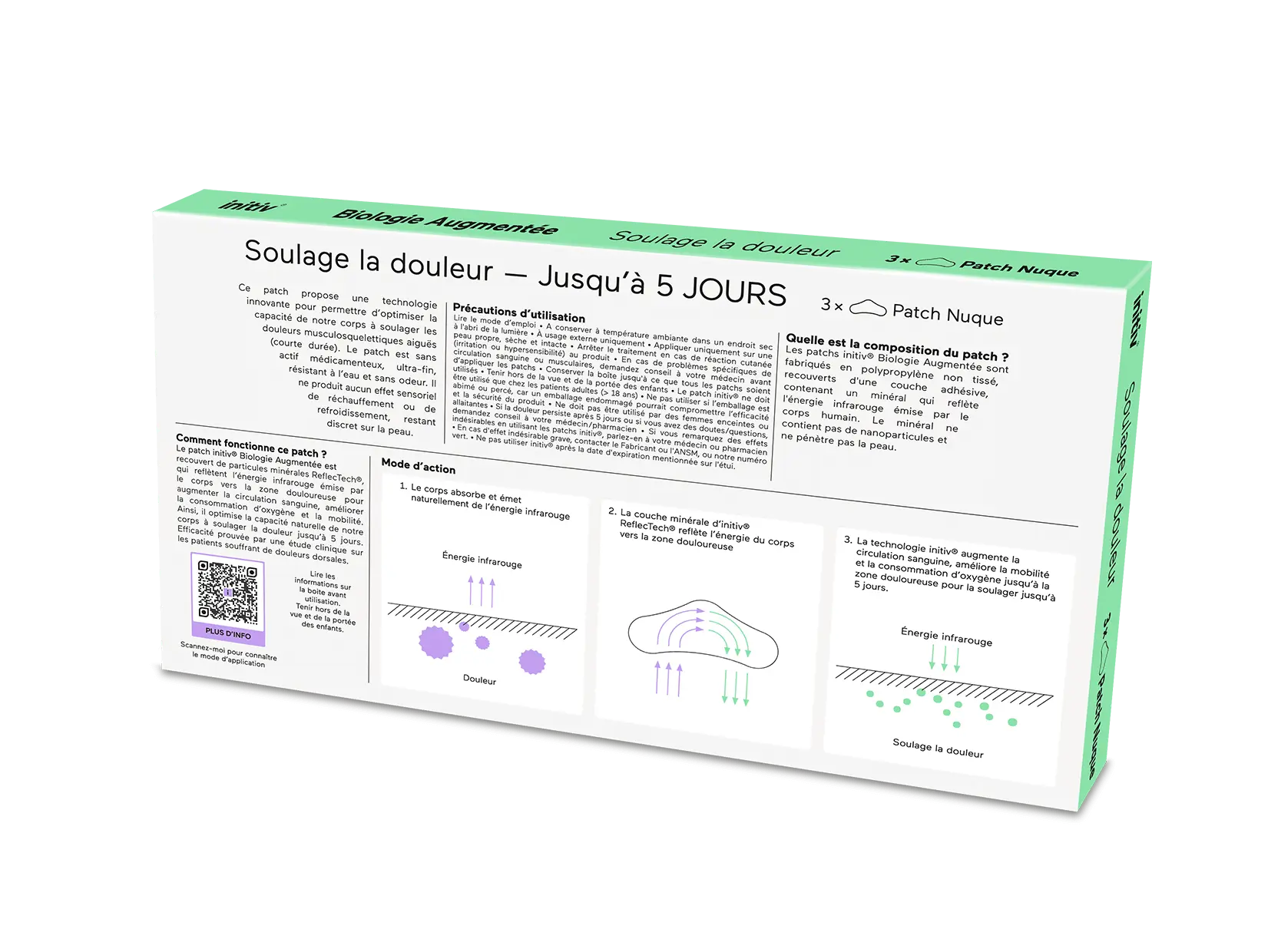 Initiv® est un patch pour la nuque sans actif médicamenteux, ultrafin, résistant à l'eau et sans odeur, conçu pour soulager les douleurs musculo-squelettiques (touchant les articulations, les muscles et les tendons) au niveau de la nuque. Grâce à la technologie ReflecTech®, le patch Initiv® pour la nuque réfléchit l'énergie infrarouge émise naturellement par le corps vers la zone douloureuse pour soulager les douleurs musculosquelettiques aiguës (courte durée) jusqu'à