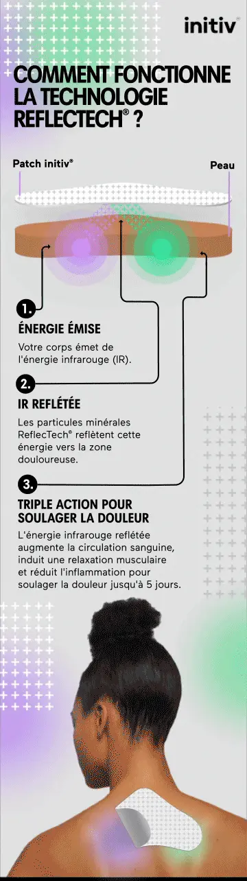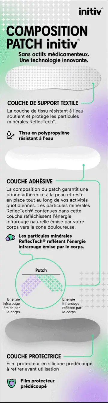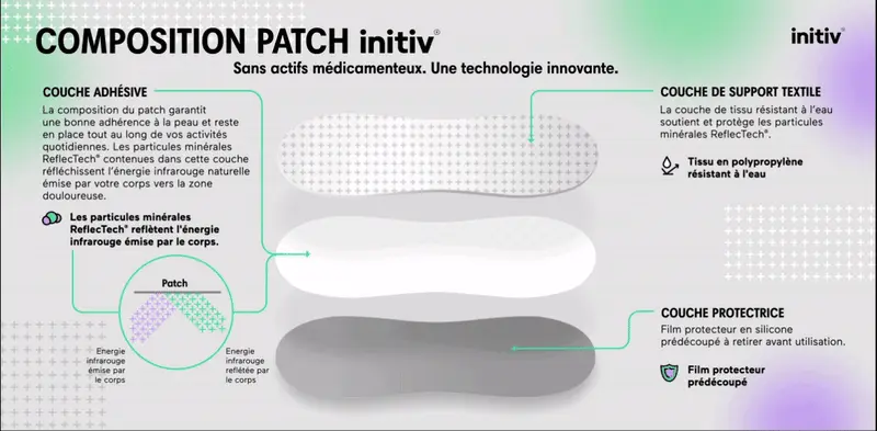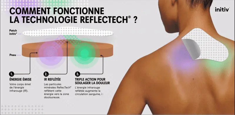 Votre corps émet de la chaleur qui génère de l'énergie infrarouge. Le patch Initiv® est recouvert de particules minérales ReflecTech®, qui reflètent l'énergie infrarouge émise par le corps vers la zone douloureuse. Cette énergie infrarouge pourra agir localement, notamment en induisant une vasodilatation (augmentation de la circulation sanguine au niveau des capillaires), une action anti-inflammatoire et anti-oxydante.
