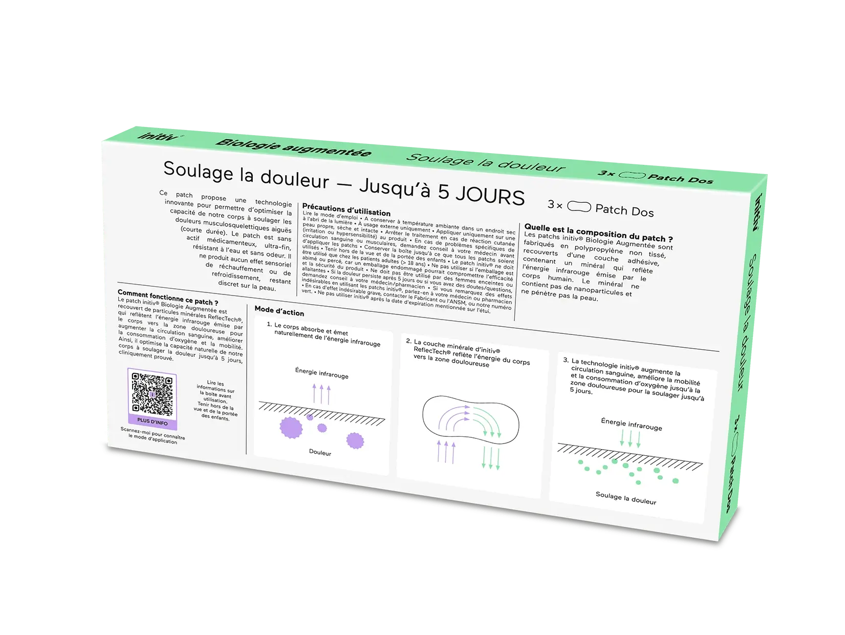 initiv® est un patch pour le dos sans actif médicamenteux, ultrafin, résistant à l'eau et sans odeur, conçu contre les douleurs musculo-squelettiques (touchant les articulations, les muscles et les tendons) au niveau du dos de l'adulte. Grâce à la technologie ReflecTech®, le patch initiv® pour le dos réfléchit l'énergie infrarouge émise naturellement par le corps vers la zone douloureuse pour soulager les douleurs musculosquelettiques aiguës (courte durée) jusqu'à cinq jours.