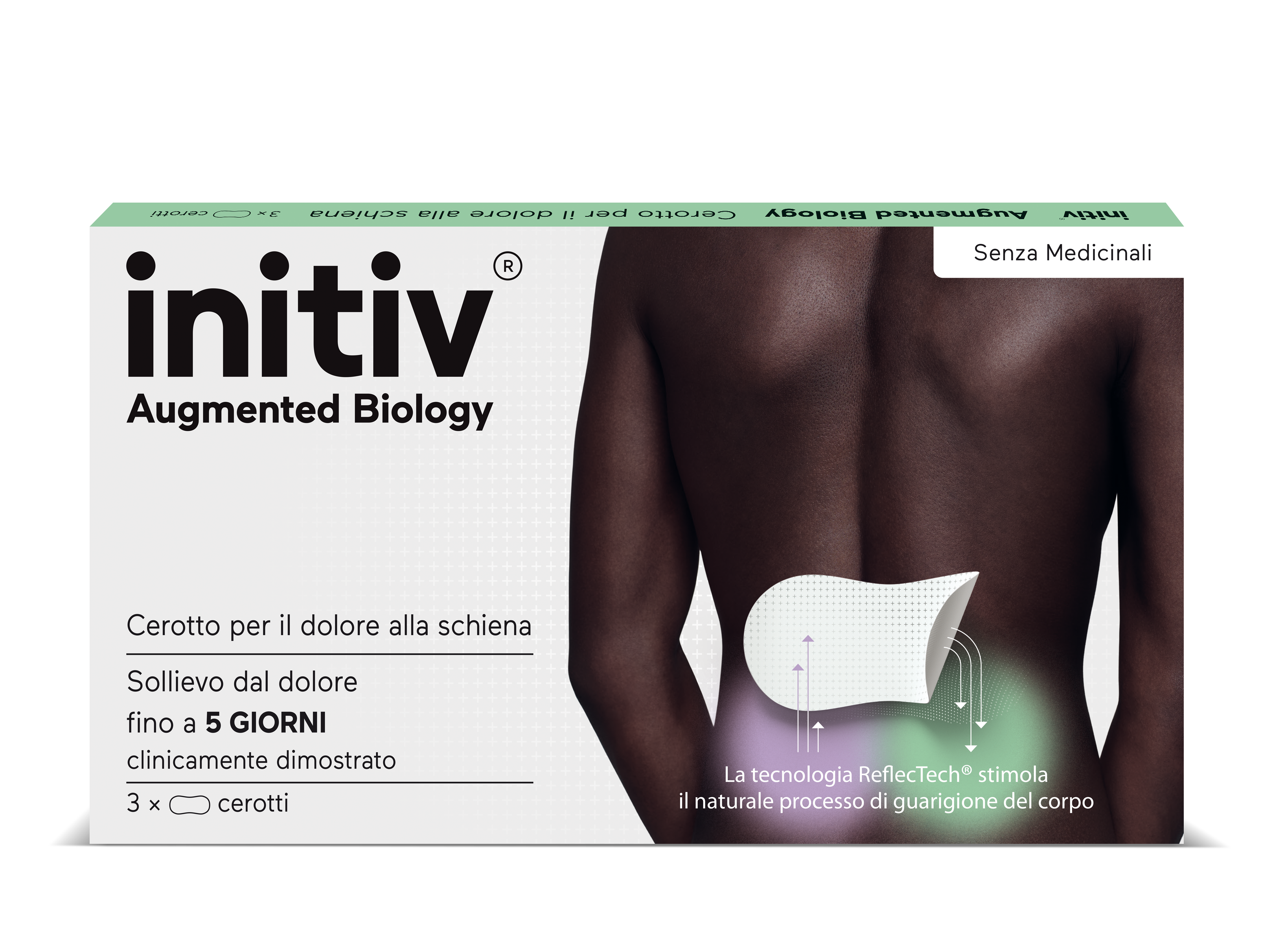 INITIV® è un cerotto senza medicinali, molto sottile, resistente all’acqua, inodore, studiato per dare sollievo dal dolore alla schiena da lieve a moderato.